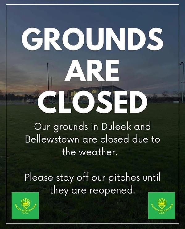 Our grounds in Duleek and Bellewstown are currently closed due to the bad weather. Please stay off our pitches until they are reopened.