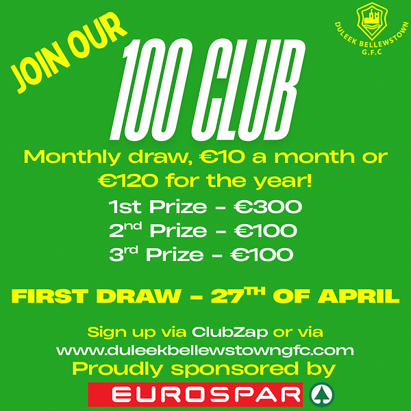 Our 100 club which is replacing our old club lotto will kick off on the 27th of April with our first draw. Our 100 club is proudly sponsored by Eurospar!