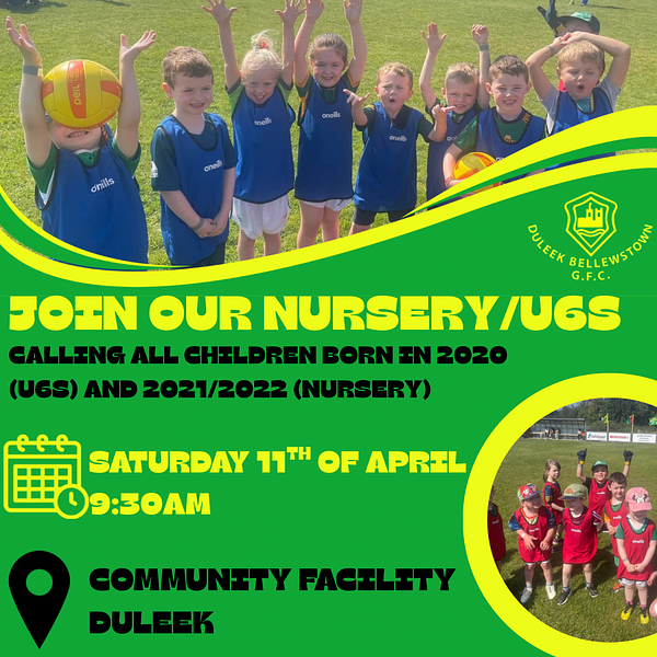 Tomorrow our U6s and Nursery begin their 2026 season. Training will take place at 9:30am at the Community Facility in Duleek (Tony Callaghan Park). This is a great chance for your child to have fun, stay active and to make new friends.