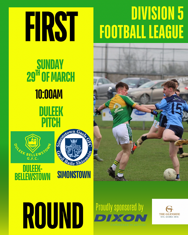 The division 5 adult men’s game which was due to take place tomorrow (17th of March) has been REFIXED for Sunday the 29th of March at 10:00am in Duleek.